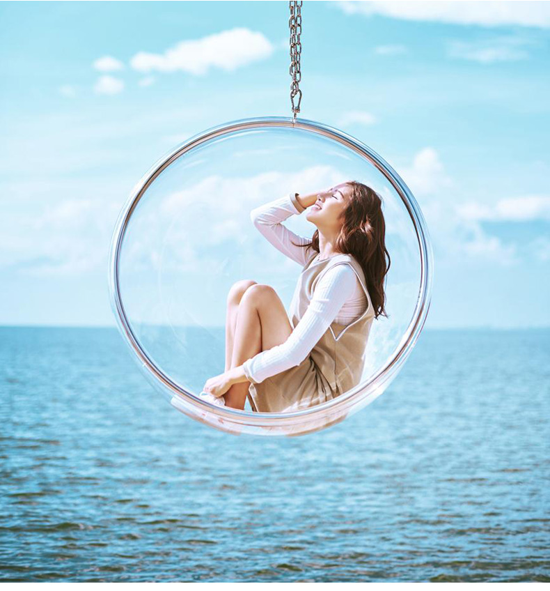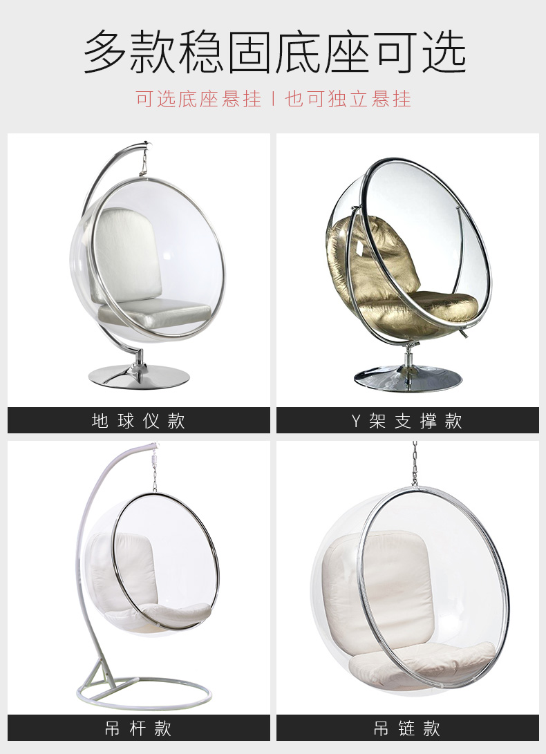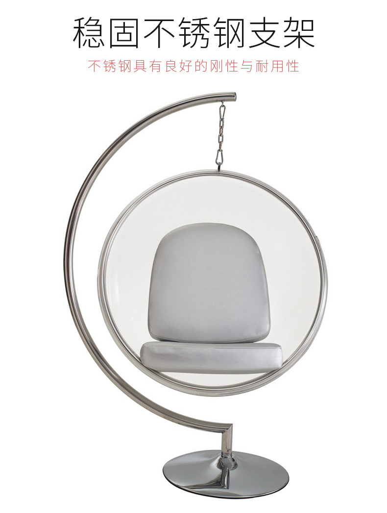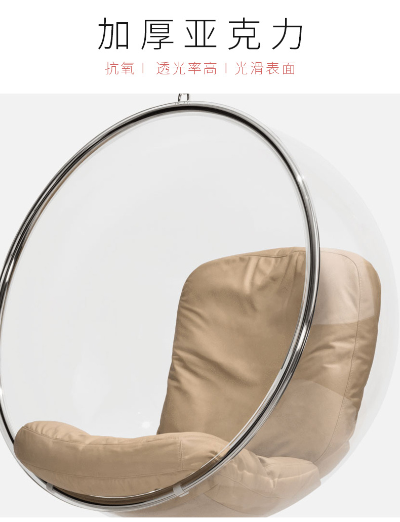 产品简介:著名的泡泡椅,灵感来自于Ball Chair,但尺寸略小,而且椅子是以亚克力制成,光线可以从四面八法头巾,亚克力加热充气,使他形成皂泡状,加入一个钢圈、椅垫制成;遮阳一个貌似轻巧的家具,但却能负重至少200公斤以上,宛如漂浮于空气中的泡泡一般,洁净而透明;带着科技感的椅子,又像置身于太空中,未来感十足。...