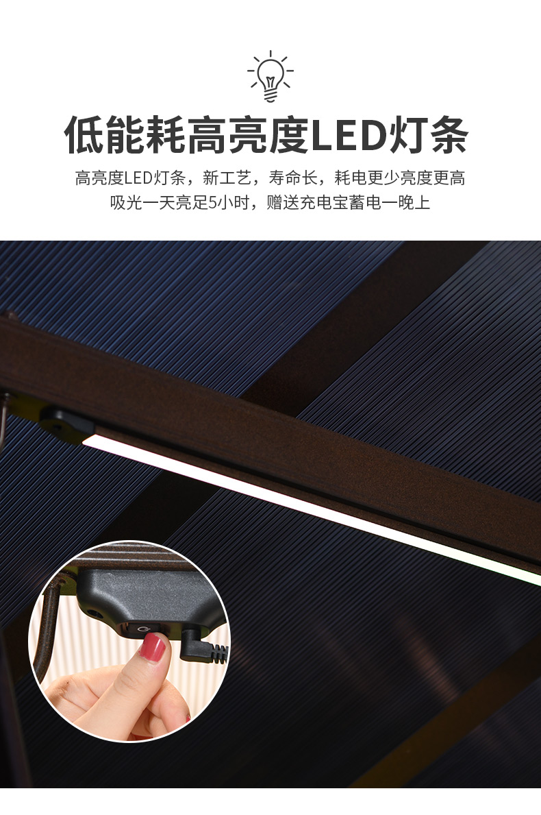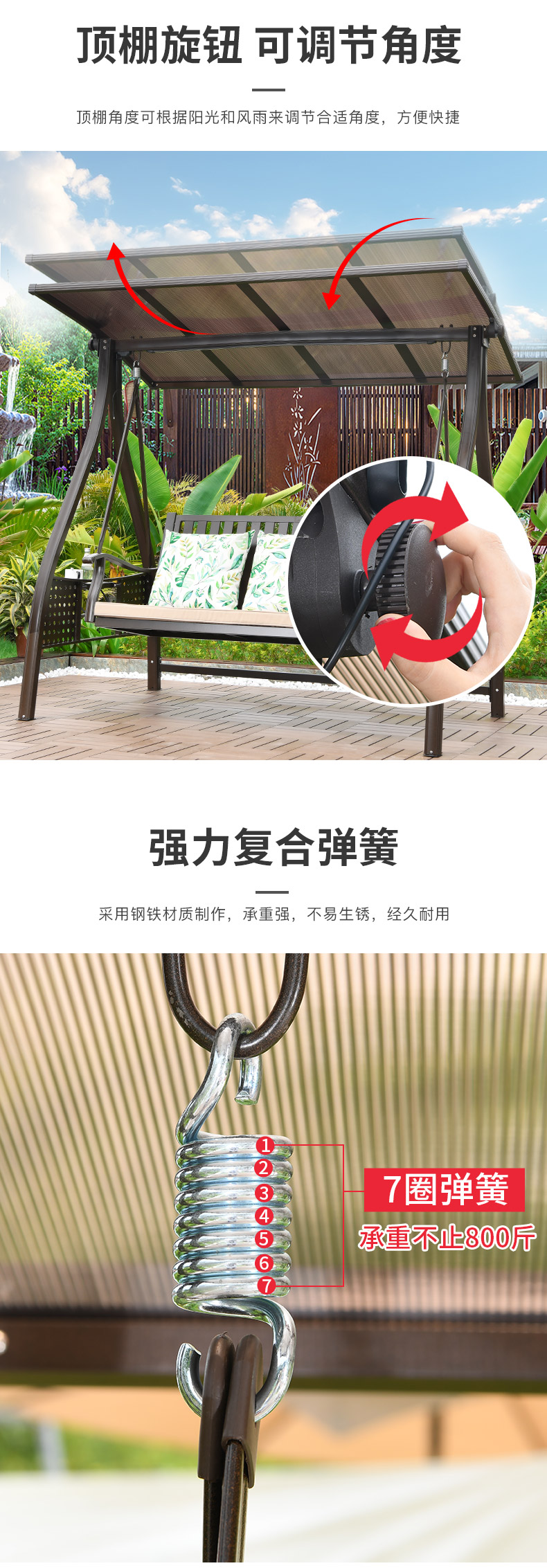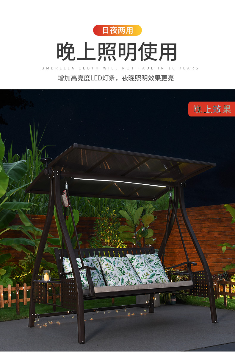 产品简介:阳光板庭院秋千,全年0电费,庭院秋千使用全铝结构不易生锈...