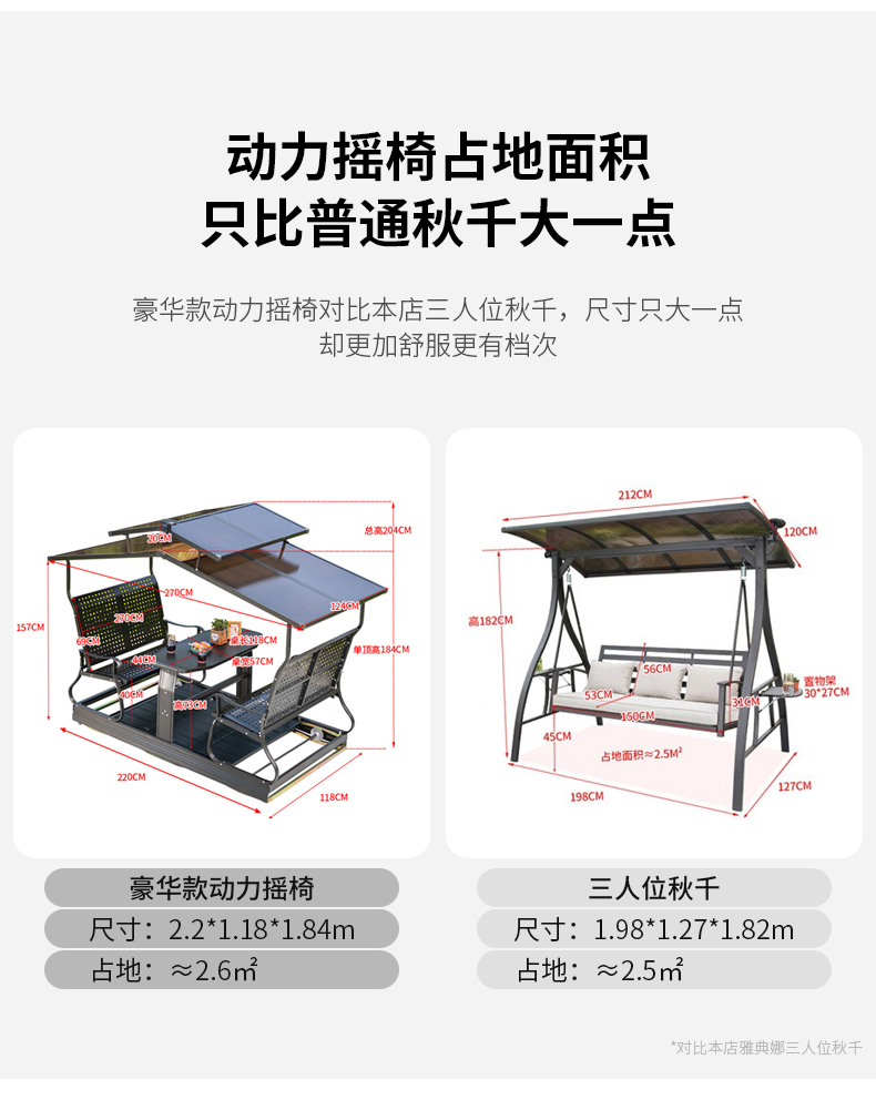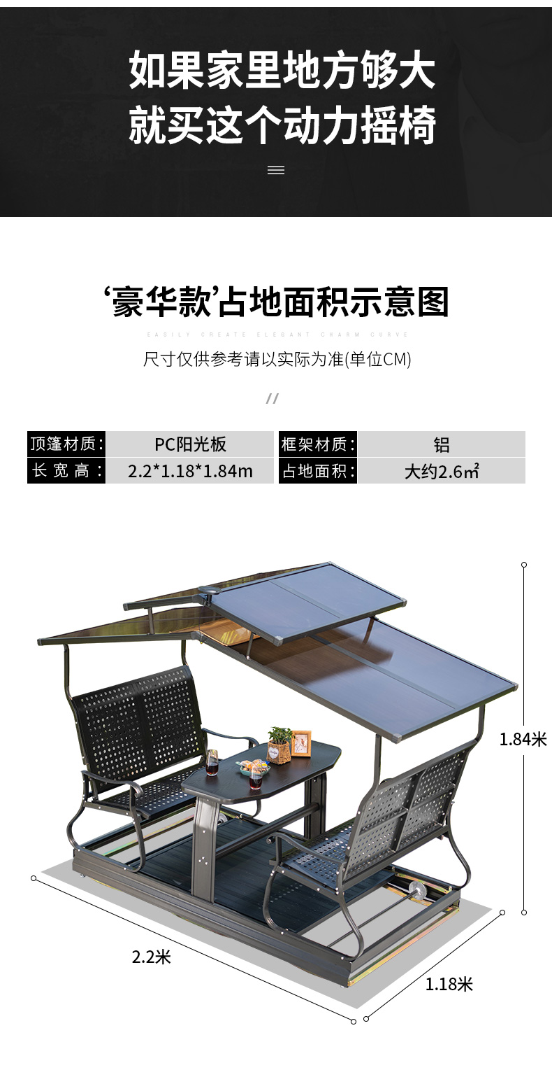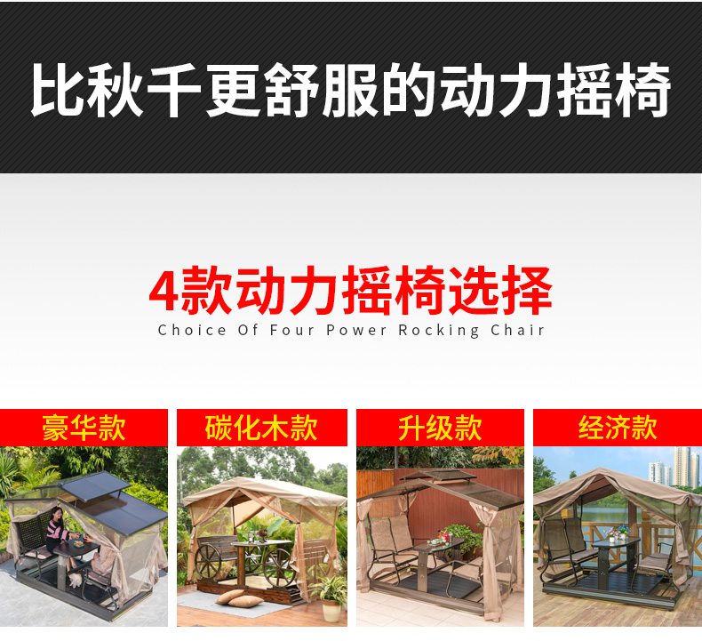 产品简介:户外动力摇椅,比庭院秋千更舒服,庭院秋千的进阶版...