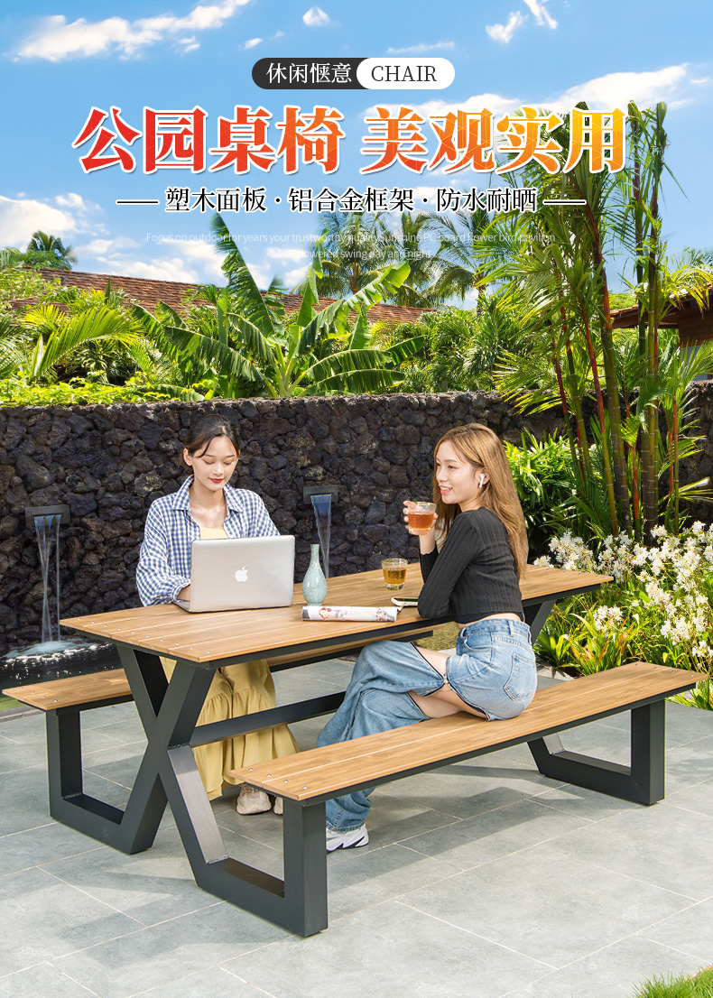 产品简介:藤朝户外公园椅户外长桌排椅室外长凳庭院休闲座椅塑木铝合金椅子...