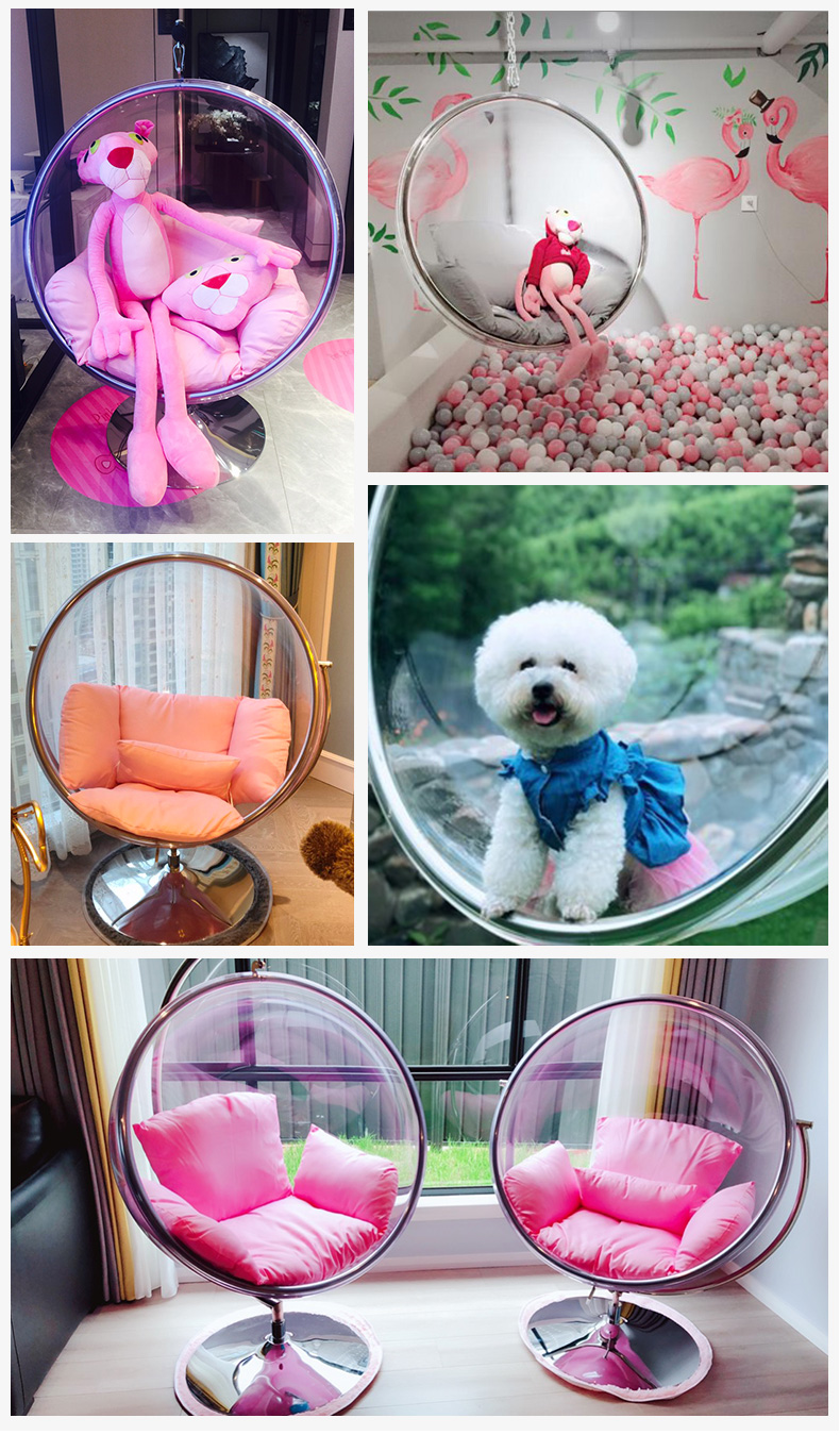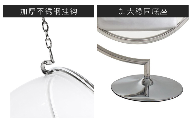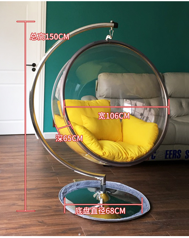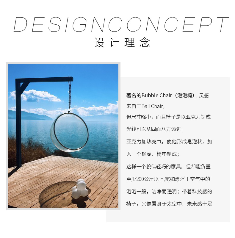 产品简介:著名的泡泡椅,灵感来自于Ball Chair,但尺寸略小,而且椅子是以亚克力制成,光线可以从四面八法头巾,亚克力加热充气,使他形成皂泡状,加入一个钢圈、椅垫制成;遮阳一个貌似轻巧的家具,但却能负重至少200公斤以上,宛如漂浮于空气中的泡泡一般,洁净而透明;带着科技感的椅子,又像置身于太空中,未来感十足。...
