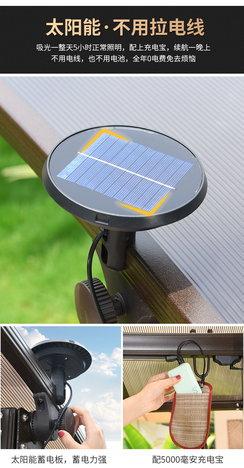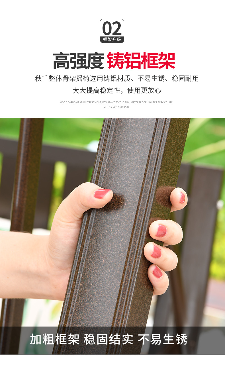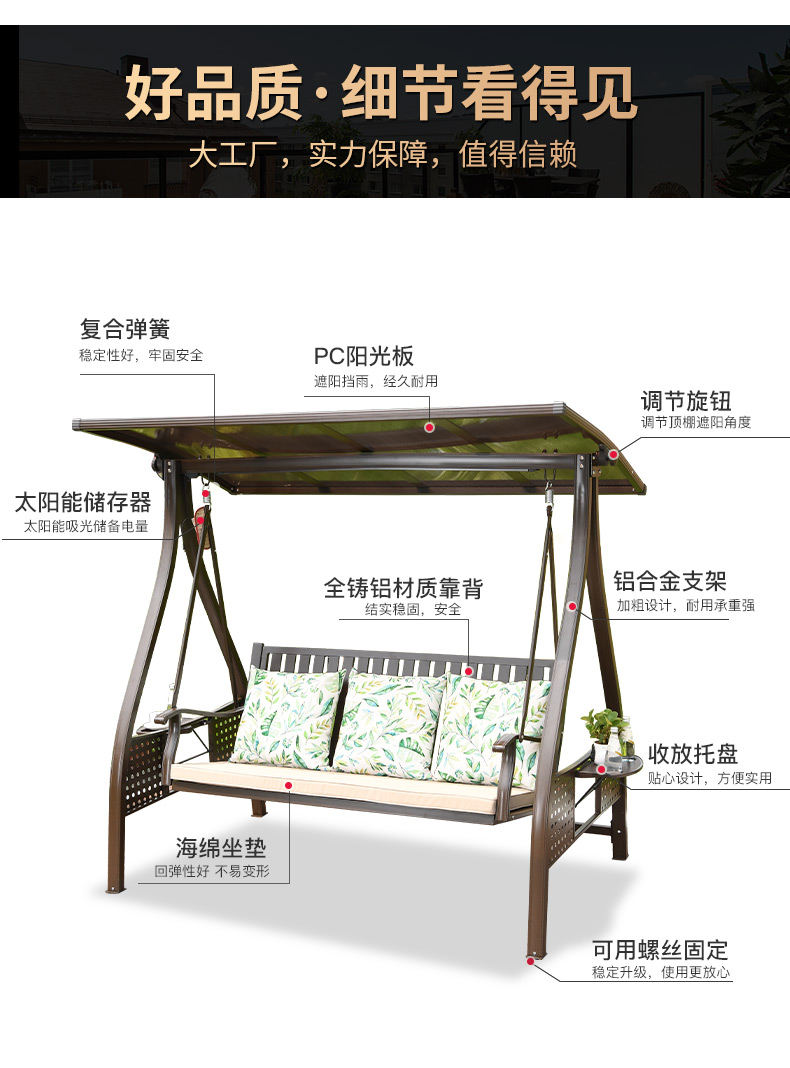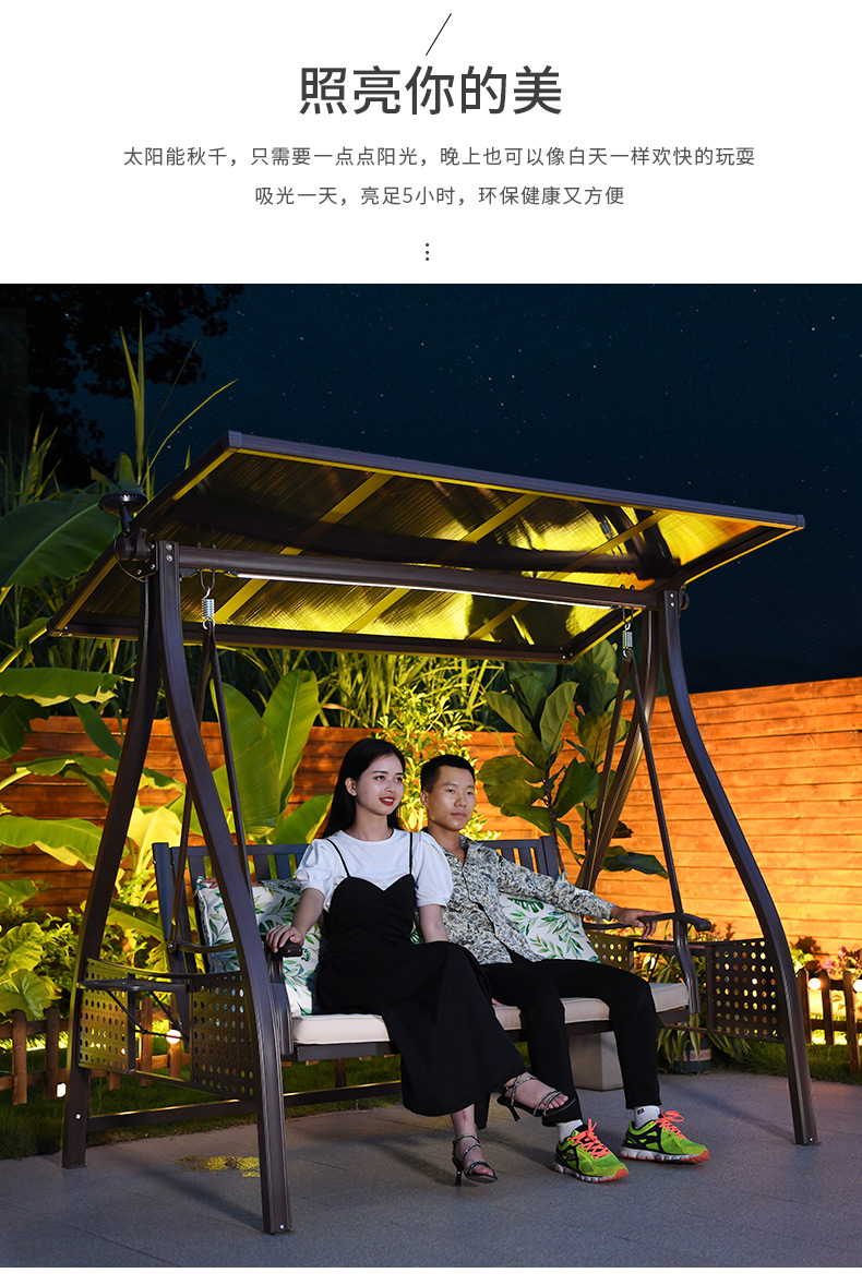 产品简介:阳光板庭院秋千,全年0电费,庭院秋千使用全铝结构不易生锈...